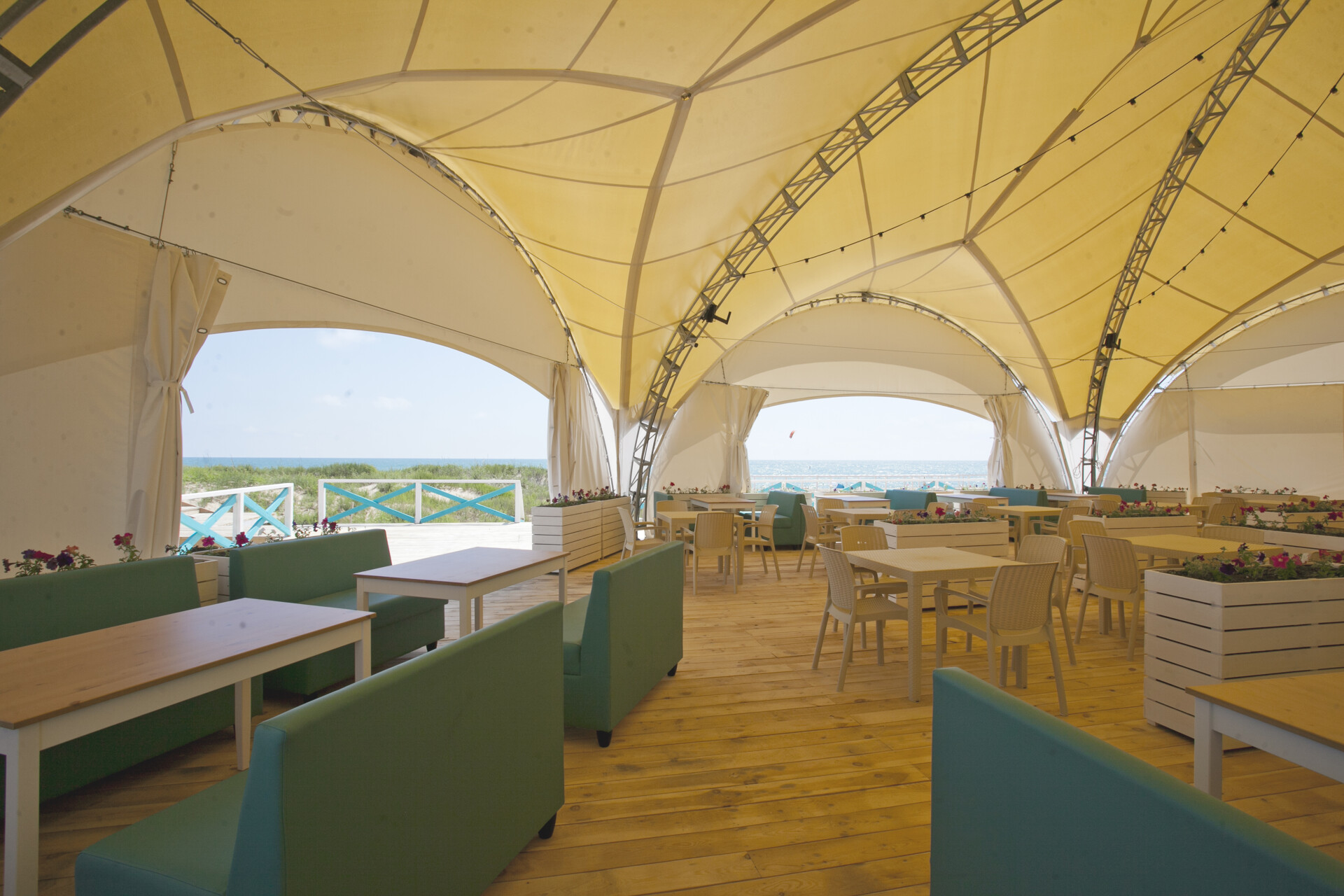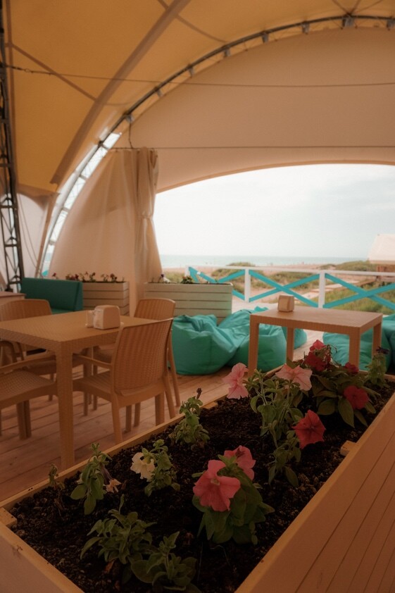 На территории просторная лаундж - зона, где вы можете насладиться прохладительными напитками и вкусными блюдами,комплексными обедами ,а также просмотром фильмов по вечерам.