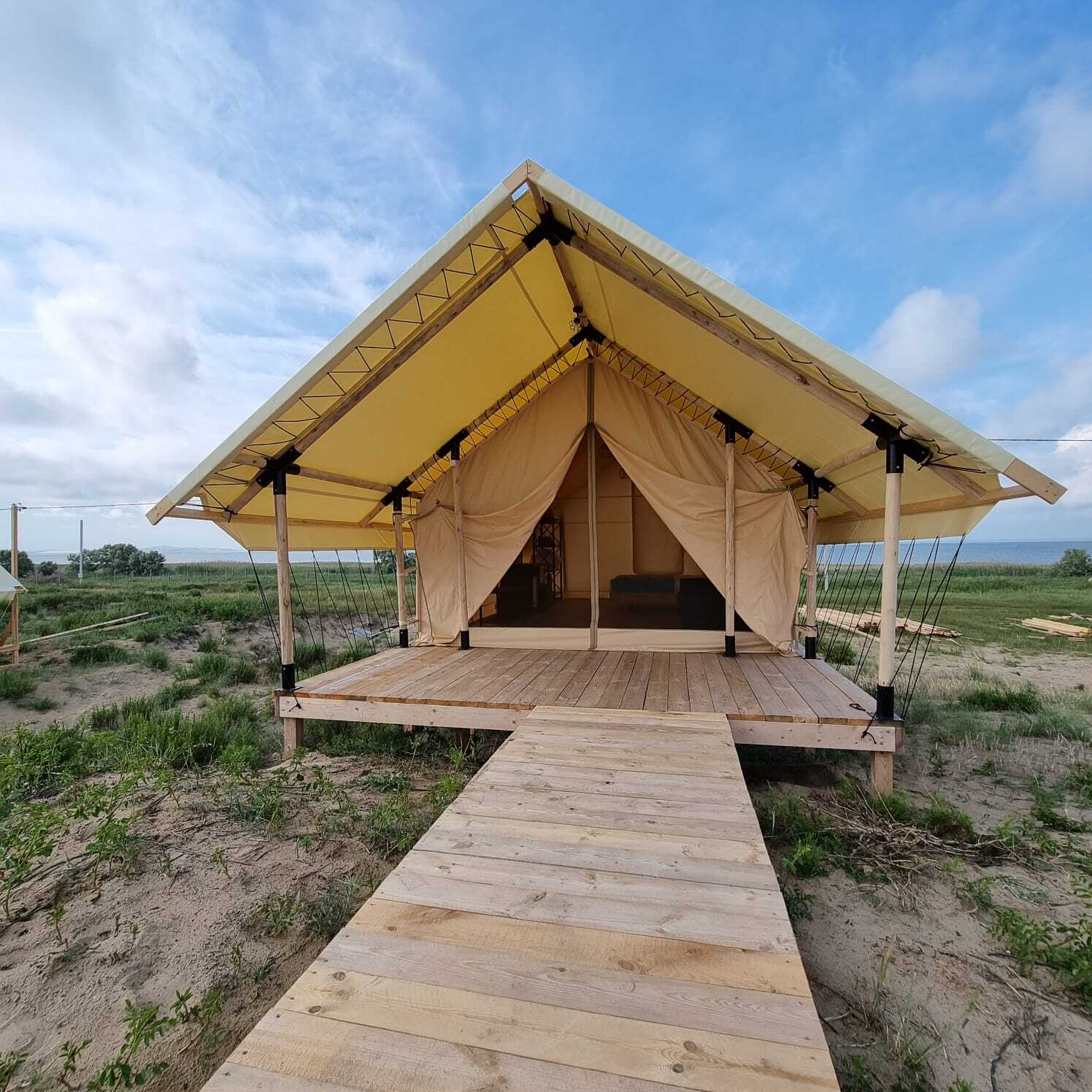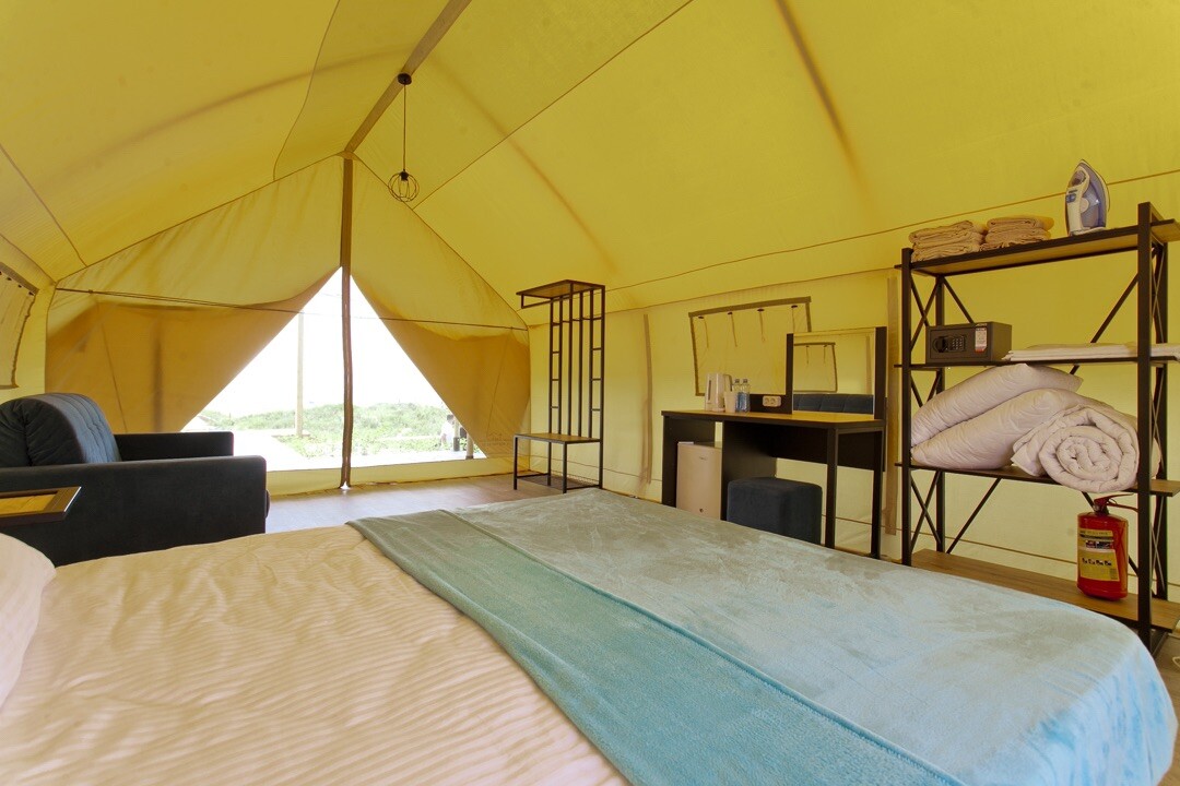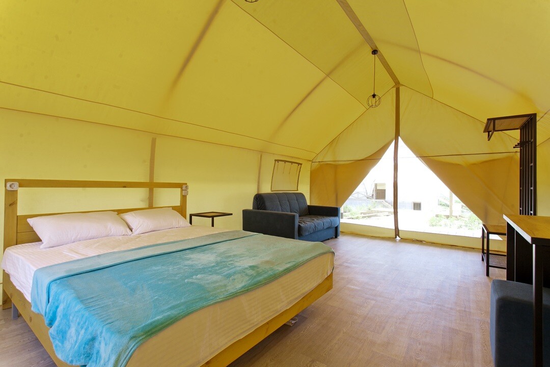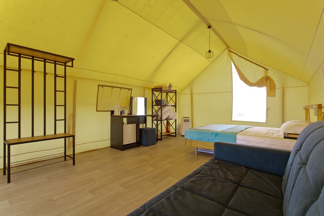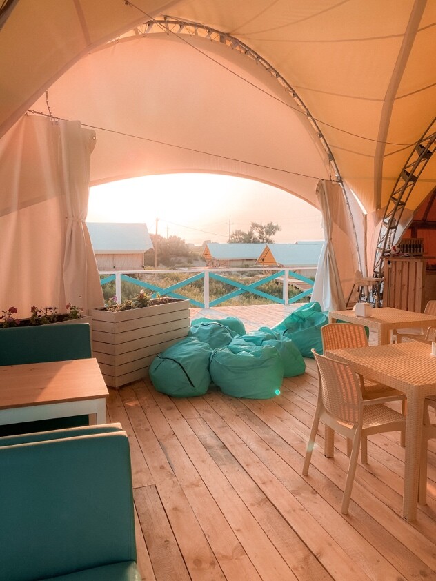 Beta Glamping - это 31 уютное бунгало на берегу моря. Каждое бунгало рассчитано на 4 человека, в нем полноценная удобная двуспальная кровать с постельным бельем,раскладной диван для двоих, банное полотенце на каждого гостя. Вся необходимая мебель: стол, пуфик, , холодильник,чайник, напольный кондиционер.